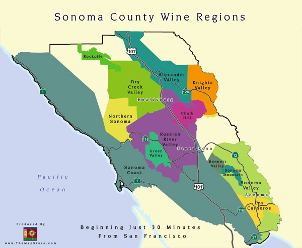 Location Sonoma County lies between Napa County and the Pacific coast, and is bordered on the north by Mendocino and Lake and the south by Marin, Solano, and Contra Costa. There is a wide variation of climate in Sonoma County. In the cooler, foggy climates of the northern stretches of Sonoma coast, Pinot Noir and Chardonnay thrive and produce fruit forward grapes.The more inland and southern areas within Sonoma County experience a warmer climate that ultimately proves most hospitable to Rhône grapes and Zinfandel.