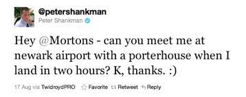 On this day ten years ago, I was a marketing manager for Morton’s The Steakhouse where one of my responsibilities was to manage our Twitter presence. So when Peter Shankman jokingly tweeted about wanting a steak when he landed at the airport, I eagerly took that on as a challenge. I researched which flight I thought Peter would be on and when/where it would land. Then I called my director to ask permission (Patty McLaughlin-Pleuss did not hesitate). And lastly, I worked with the amazing management team at Morton’s in Hackensack (Mike Khorosh and Karleen Koerkel) to organize the logistics. I remember Mike saying, if we are going to do this, we need to act now… and within minutes, Alex from his team was in his tuxedo riding up to Newark Airport with steak in hand. And the rest is history!